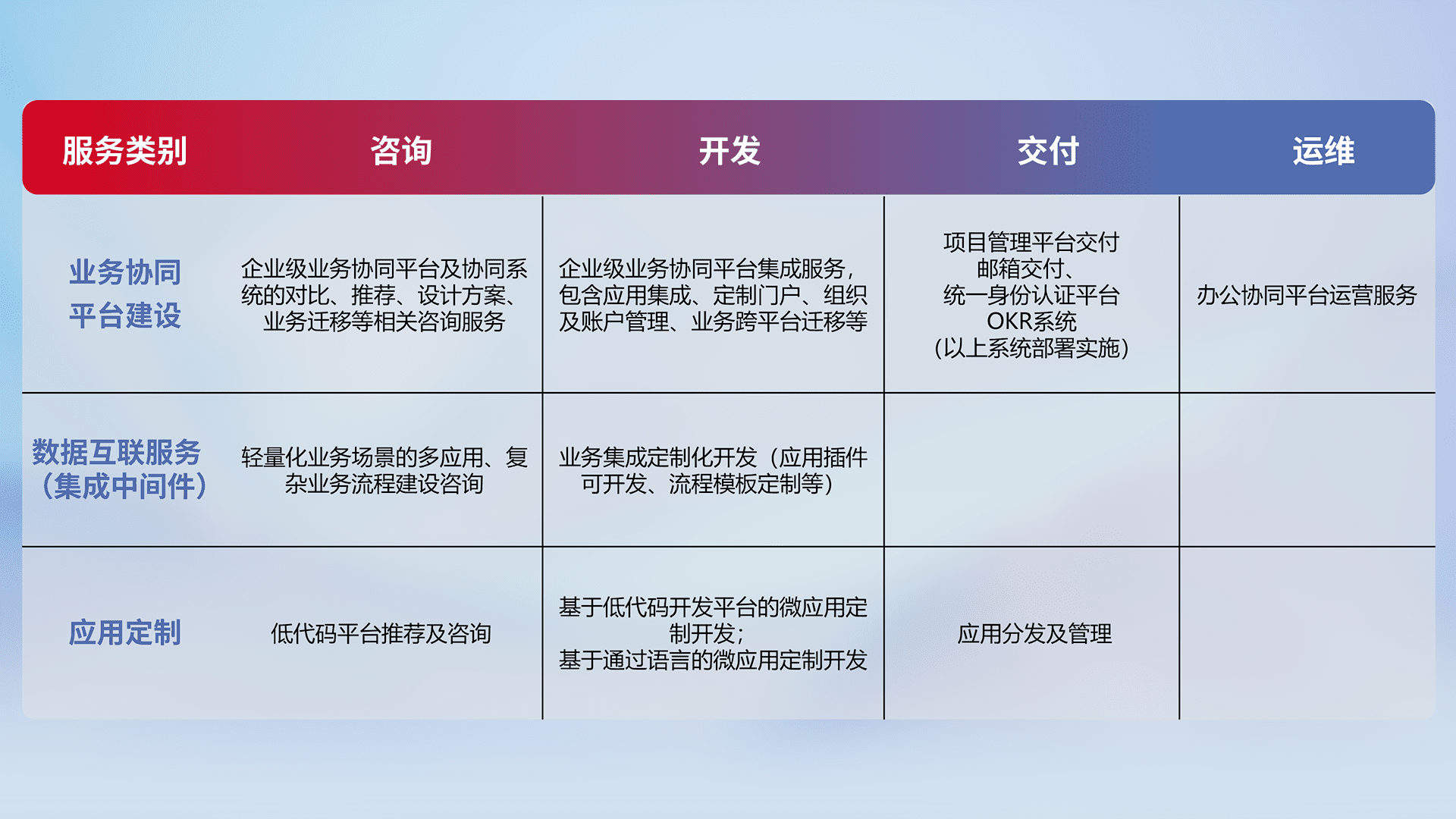 针对钉钉、、企微、、IDaas等平台级产品提供产品的规划、、、、方案、、、、交付、、、定制化开发等服务,,,实现如统一协同办公、、、智能客户服务、、混合会议管理、、智能数据查询、、、等业务场景,,,实现数字化转型。。。
